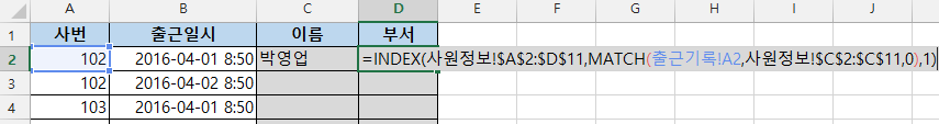 =INDEX(사원정보!$A$2:$D$11,MATCH(출근기록!A2,사원정보!$C$2:$C$11,0),1)
